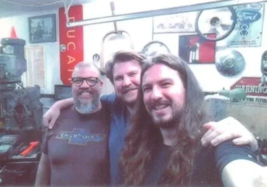 Three men smiling, taking a selfie in a garage or workshop with various tools and posters in the background.